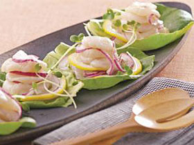 (3)の鍋に油大さじ2を足し、食べやすく切ったエリンギと(2)を入れて弱火でゆっくりと炒める。きのこがしんなりしたらほたてをもどして、パセリを加え、炒め合わせて塩とこしょう各少々で調味し、器に盛ってくし形に切ったレモンを添える。