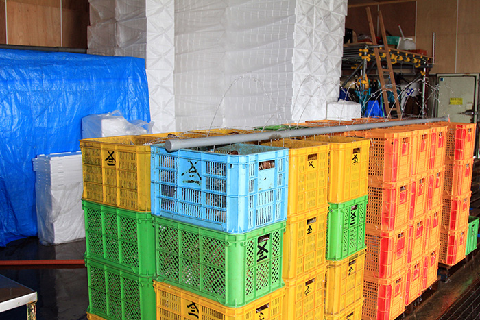 また、ここでは底建網漁ばかりではなく、カキやホタテの養殖も盛んに行われており、この日も早朝からホタテの出荷作業が行われていた。暖流と親潮に恵まれた海域、そこで育つカキやホタテは味が濃くてとても美味だ。特筆は義務であるノロウィルスの検査だが、週1回行われるその検査を自主的に週2回行うことにより、さらに高い安全性を維持することに努めている点である。味と安定した量と同時に高い安全性は、消費者にとっては購入する際の大きな事柄である。