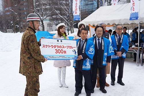 さっぽろ雪まつりの雪像制作が佳境を迎える1月22日(木)、会場となる大通公園西8丁目会場で、胆振・渡島すけとうたら刺網漁業協議会(村田会長・鹿部漁協組合長)、北海道水産林務部、ぎょれんなどが協力して、雪像制作にあたる自衛隊員や関係者にすけとうたらを具材としたスープカレーを提供しました。